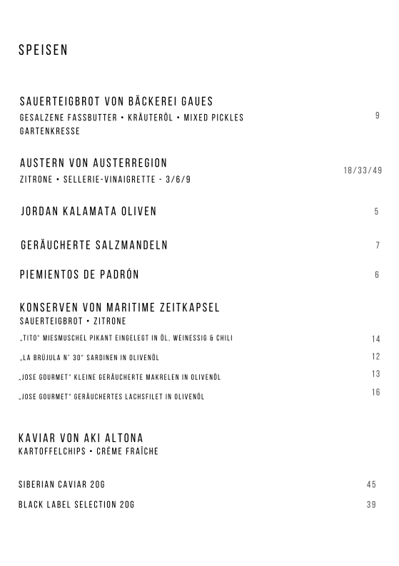 From a reviewer’s perspective, the menu at Bar Rique Winehouse | Weinbar & Restaurant in Ludwig-Franzius-Platz 8 reflects a refined, wine-driven culinary philosophy that prioritizes quality ingredients and elegant simplicity. The selection of small plates under Speisen sets the tone perfectly, beginning with SAUERTEIGBROT VON BÄCKEREI GAUES, a rustic sourdough bread that immediately signals craftsmanship and respect for local baking traditions. Seafood lovers will appreciate AUSTERN VON AUSTERREGION, offering pure, fresh flavors that pair naturally with the restaurant’s wine focus. For lighter, Mediterranean-inspired bites, JORDAN KALAMATA OLIVEN and GERÄUCHERTE SALZMANDELN provide salty, aromatic contrasts, while PIEMIENTOS DE PADRÓN add a playful Spanish touch with their mild heat and smoky character.
