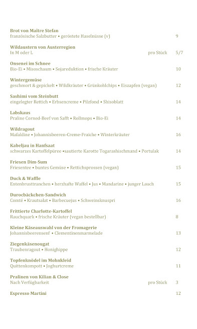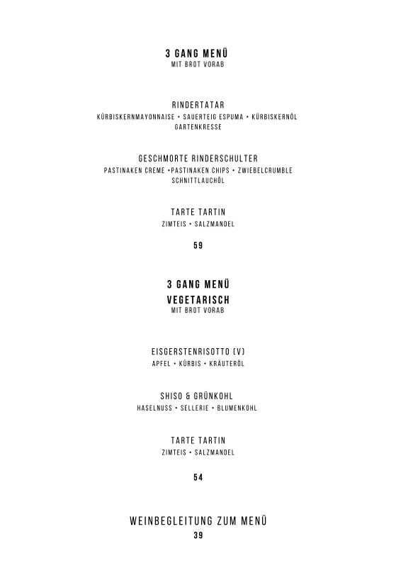 MIT BROT VORAB. RINDERTATAR (KÜRBISKERNMAYONNAISE • SAUERTEIG ESPUMA • KÜRBISKERNÖL GARTENKRESSE), GESCHMORTE RINDERSCHULTER (PASTINAKEN CREME • PASTINAKEN CHIPS • ZWIEBELCRUMBLE • SCHNITTLAUCHÖL), TARTE TATIN (ZIMTEIS • SALZMANDEL)